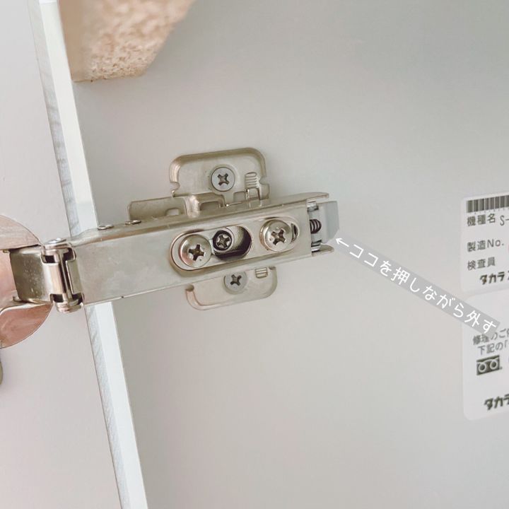 丁番の奥にある着脱レバーを押すだけで、扉はカンタンに取り外せます。