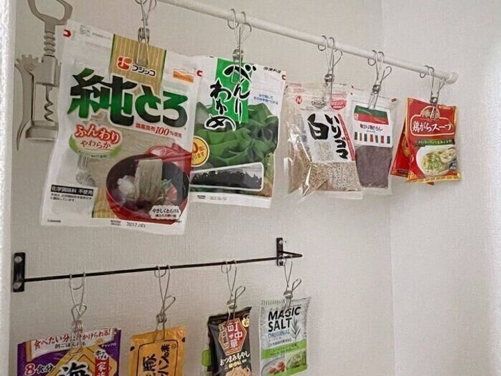 無印良品の「ステンレスひっかけるワイヤークリップ」に挟んで引っ掛ければ、一目で探せる乾物収納の出来上がり。