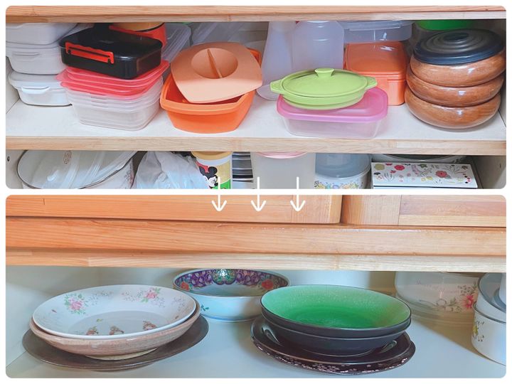 重たい大皿が頭上の棚上に、軽いタッパー類が棚下に置かれていました。