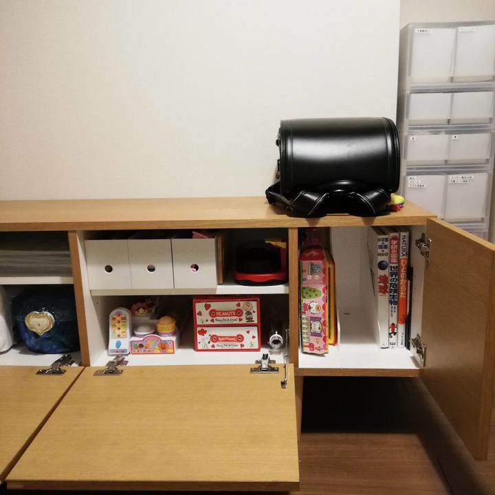 テレビをコンパクトにしたので、テレビ台が不要になり代わりに子供のおもちゃや学習用品入れにしました。