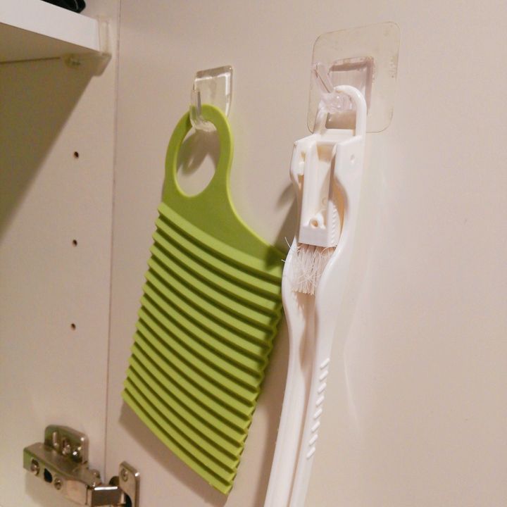 狭い洗面収納の扉裏には、ミニ洗濯板とシューズブラシを引っ掛けています。