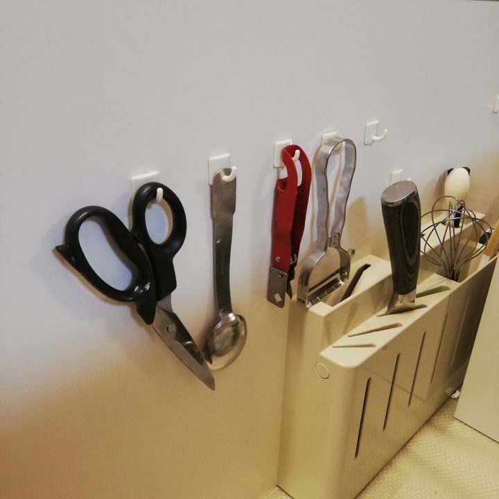 キッチン用品は数も多く、掛けられるものも多いので掛けられる小物はシンクした収納の扉裏に小さな粘着フックを取り付けて掛けています。