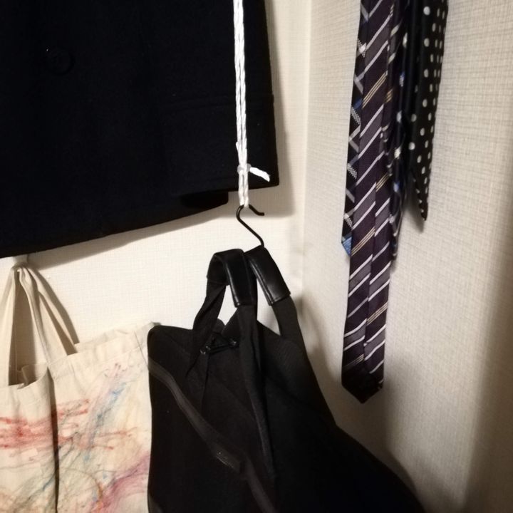 我が家では出番が少ないけど必要な時にすぐ取り出したいビジネスバッグは、紐+S字フックで対応します。