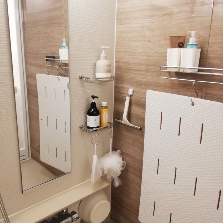 お風呂の収納でも、お風呂マットや泡立てボールを掛けるためにS字フックを使っています。
