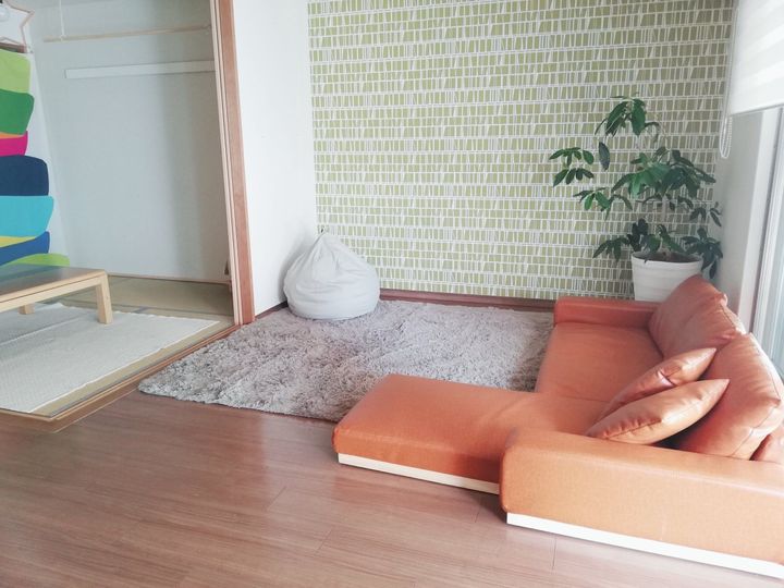 ダイニングテーブルはなく座卓で食事をしていますが、やはり食べこぼし等は気になるので、ここには座卓を置かずにくつろぐスペースとして使うことにしました。
