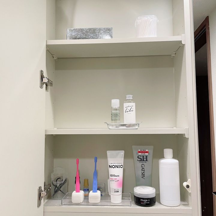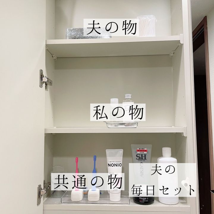 基本的に人別が分かりやすいですが、歯磨きやフロス等はまとめていた方が分かりやすいので、1番取り出しやすい位置にまとめて置くことにしました。
