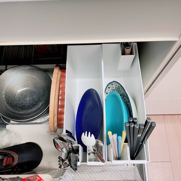 例えば、ファイルボックスは左は小皿、右は大皿を収納し、ペンポケットにそれぞれカトラリーを種類別収納にすると、迷子になりません。