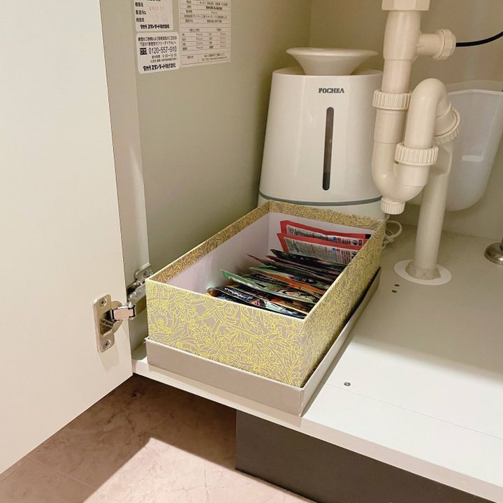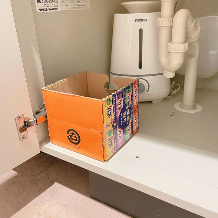 いつか買わなくなるかもしれない入浴剤のための収納にお金をかけるのは経済的ではないので、以前は入浴剤の箱の口を切っただけでした。