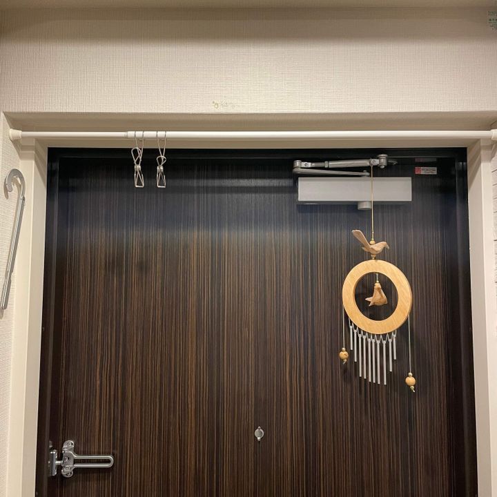 突っ張り棒を玄関の入り口に設置し、ワイヤークリップを掛けるだけです。