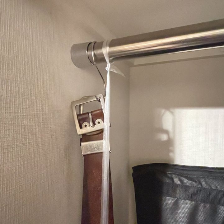 紐がぶら下がっており、下に棒をとりつけるだけのシンプル収納です。