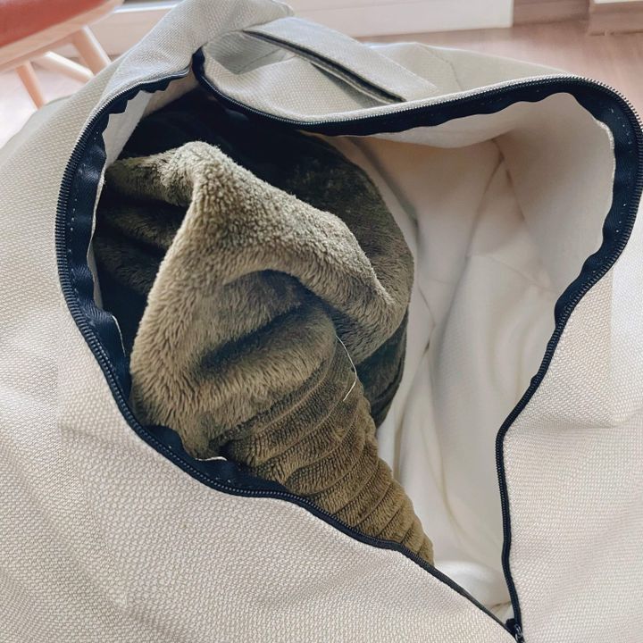 ALLビーズクッションの心地良さには敵いませんが、こたつ布団収納に悩まされるプチストレスや出し入れる手間を考えれば、クッションカバーに入れて出しっぱなしが気楽でした。
