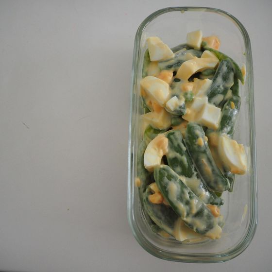 ・ゆで卵を潰してマヨネーズ ・塩で味をつけたらそこに茹でたスナップえんどうを投入。