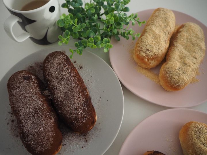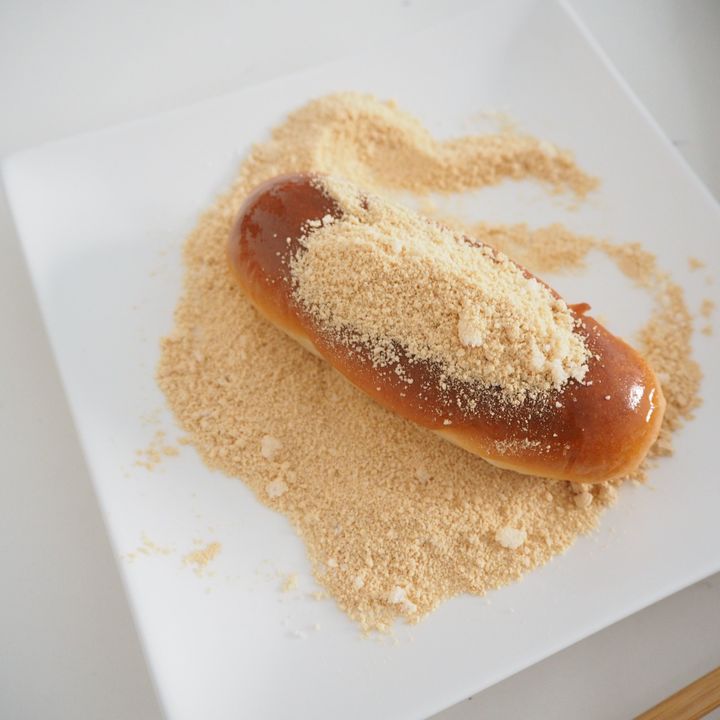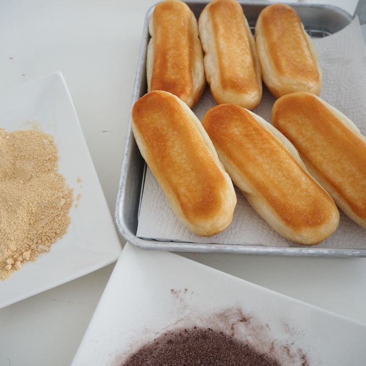 上がったから事前に用意していたココアシュガーときなこをまぶします。