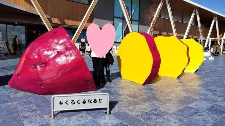 サツマイモの巨大オブジェがお出迎え~。写真撮影されている方、多数。