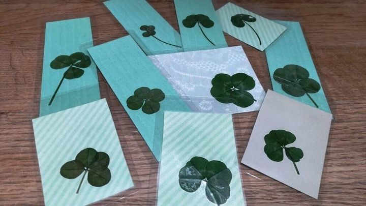 ひと月ほど前に「公園で遊んでくる!」と家を飛び出した息子が10分ほどで帰ってきたので、「どうしたの??」と聞くと、「公園に四つ葉のクローバーがいっぱいあってん!」と、その手には十数枚の四つ葉のクローバーが!いわく「サッカーボールが転がって行った先で見つけた」とか。ラッキーだね~!すごいね~!と押し花に。すっかり忘れていたのですが、雨でやることも無いので、ラミネートしてしおりを作りました♪