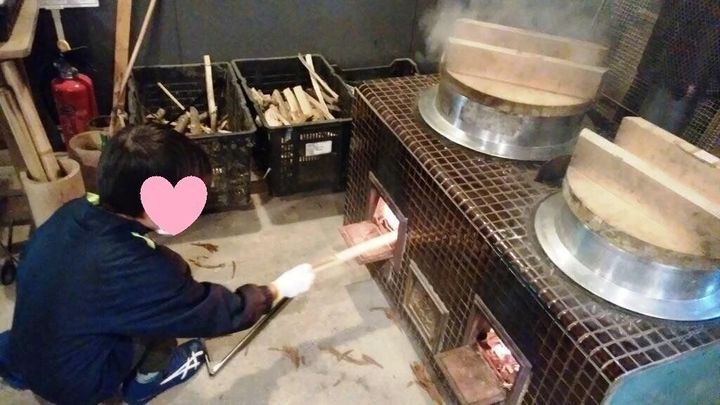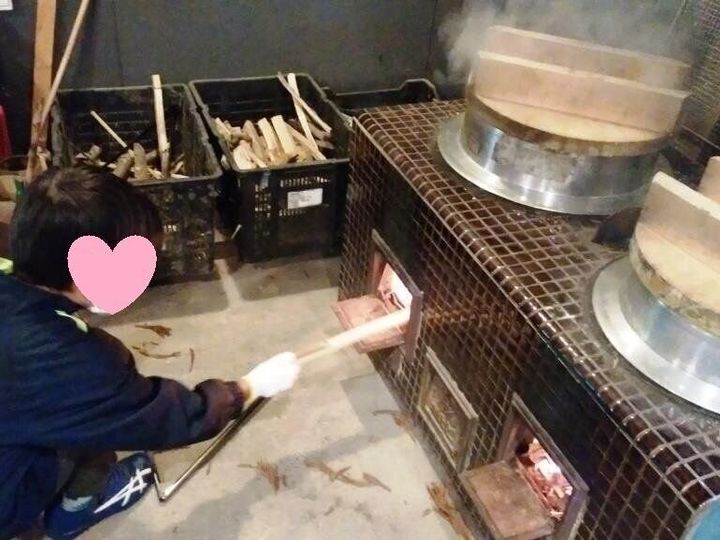 一方、息子は薪を割り、釜炊きご飯作りのお手伝い♪↓