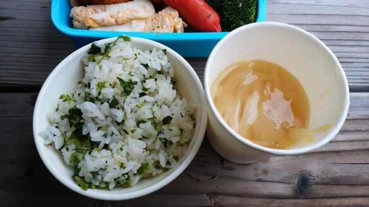 炊き立てお釜ごはん(野草入り)&玉ねぎと冬瓜のスープと一緒に昼食タイム♪↓