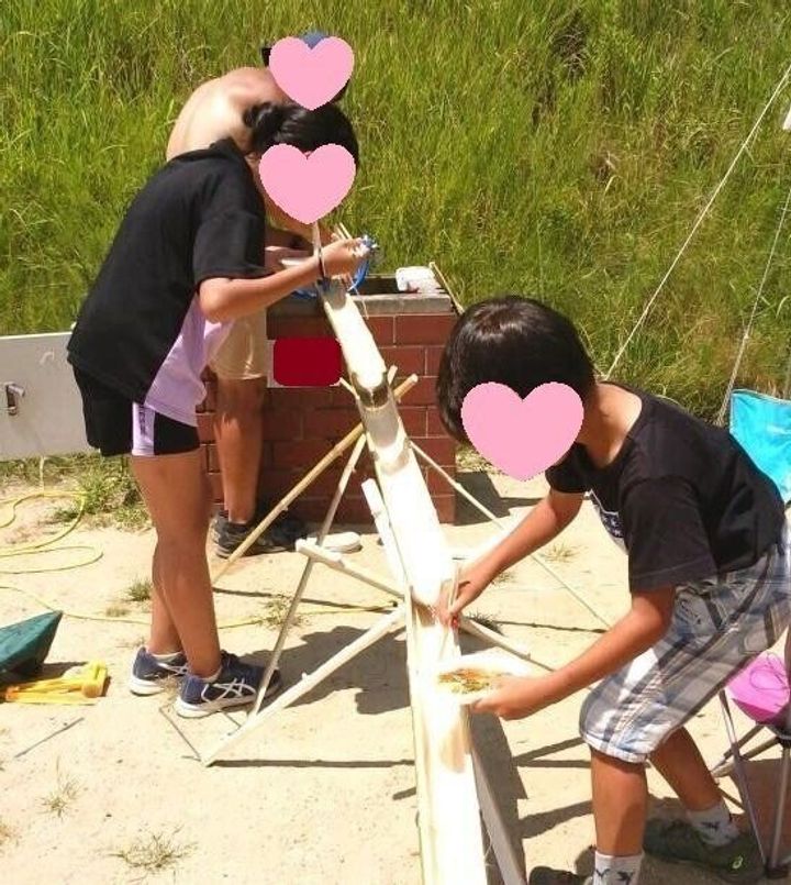 パパが仕事関係の方に頼んで、竹をいただいて帰り・・・節を削ったりするところから作成。接続部分や柱の部分が、なかなか大変でしたが・・・自作の流しそうめん器?が完成。