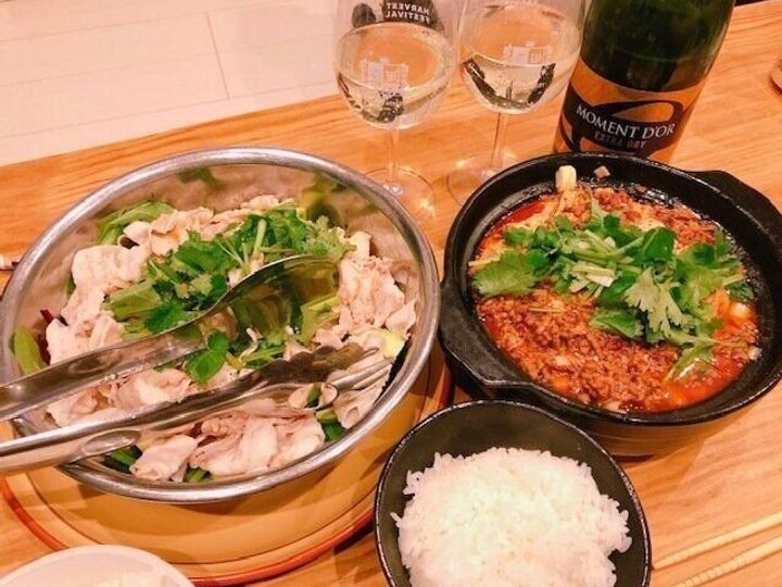 新しい食器がなくても、食卓は変化します。この日は、「麻婆豆腐」と『豚しゃぶのタイ風サラダ』。麻婆豆腐は土鍋を器代わりに。サラダは混ぜたボウルのまま食卓へ。ボウルを乗せる下のお皿の色を、赤・緑・ブルー・黒・ガラス皿などに変えると、雰囲気がガラリと変わります。使っていないお猪口などがあれば、和え物やおつまみ・ナッツ入れにしますし、素敵ではあるけれど、お客様に緑茶を入れることも少なくなった茶器は、夏の麺つゆ入れとして、使用したりもしております。