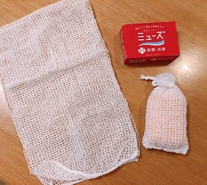 わが家、お安くて肌にも優しいので石鹸を利用しています。泡立ちを簡単にするため、お手製のカバーをつけています(カバーがあると最後まで使い切ることが可能です)。旅先でもらう入浴用ボディタオルを適当にカットして縫い、余り紐を通して出来上がり。針・糸・紐、どこのお宅にもありますよね。作成時間5分ほどです。