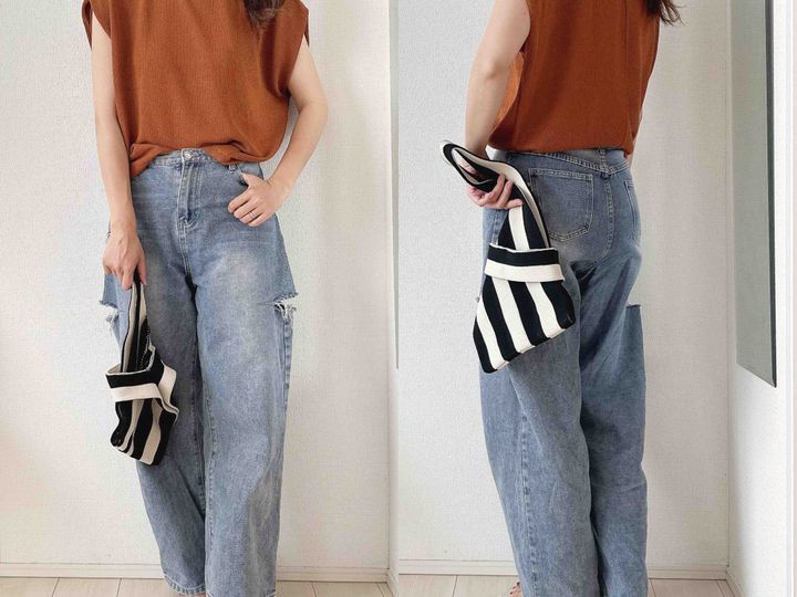 まずはデニムと合わせてカジュアルなコーデにしてみました。Tシャツだとカジュアルすぎるデニムコーデもこちらのトップスならちょっとオシャレなカジュアルコーデに見えるところがお気に入りです。また、半袖とノースリーブの中間のような絶妙な長さの袖が二の腕をほっそりカバーしてくれてアラフォーに嬉しいトップスでした。