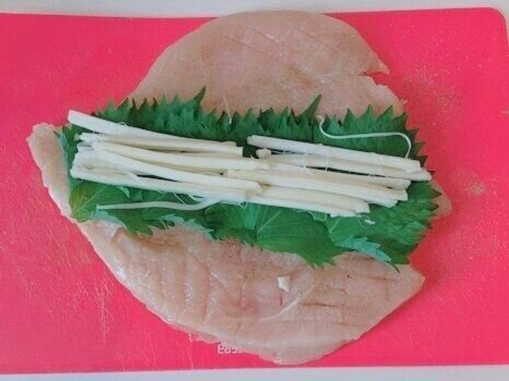両端の鶏むね肉を内側に折りたたんでから、ぐるぐる巻いていきます。