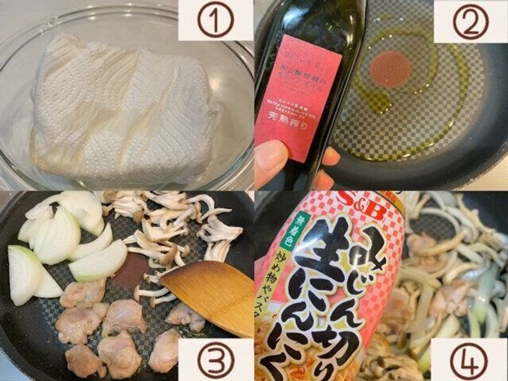 鶏もも肉、しめじ、玉ねぎの順に入れ、鶏もも肉に中火が通るまで炒めます。