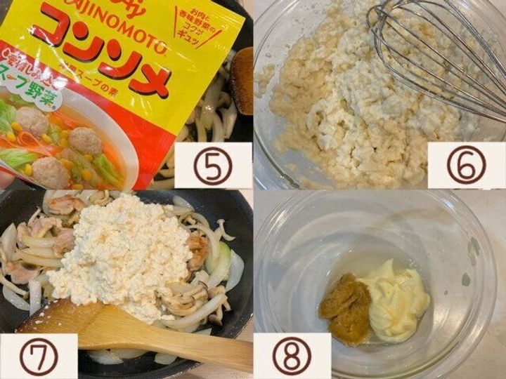 ⑦フライパンに加え混ぜ合わせ、3分ほど弱火で煮込む