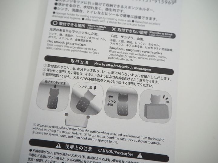 開封してスポンジホルダーをシンクに貼り付けていきます。粘着テープと接地面をしっかりと固定して貼り付けて、粘着力を高めるために数時間そのままの状態にしておきます。