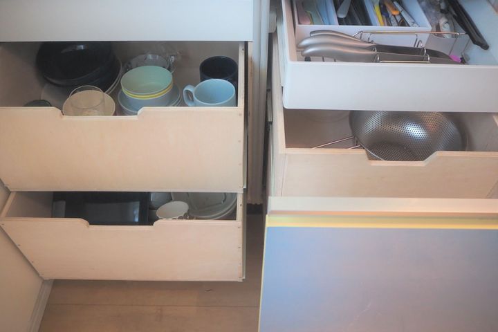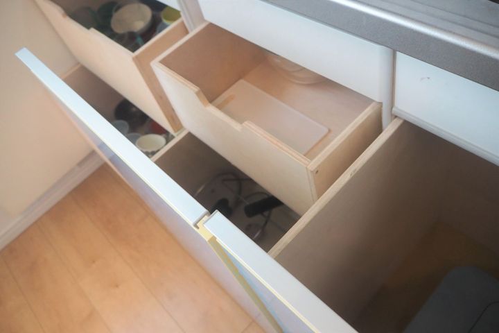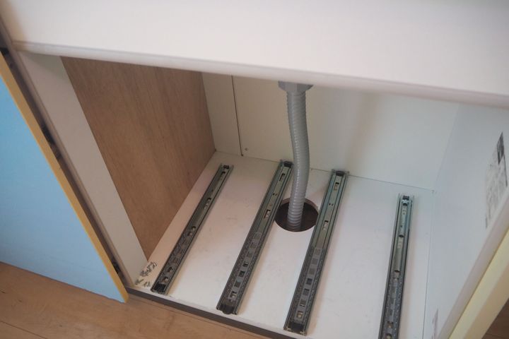 そして真ん中の収納です。こちらには作り付けであった引き出しをそのまま活用するために扉付きの引き出しと中から取り出すタイプの引き出しを取り付けています。スライドレールをサイドに取り付けて引き出せるようにしました。