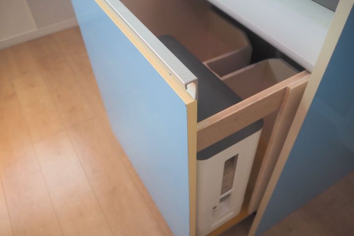 開き戸の蝶番があるため中に箱を作りそこに引き出しを取り付ける方法で設計しています。この方法だとアパートなどの賃貸住宅でも原状回復が可能になります。