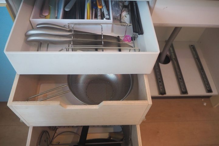 私は何とか収納力を上げたいと思い「引き出し」を取り付けることにしました。親世帯のシステムキッチンを参考に自分が使いやすい引き出し収納を取り入れて設計し、組み立てていきます。