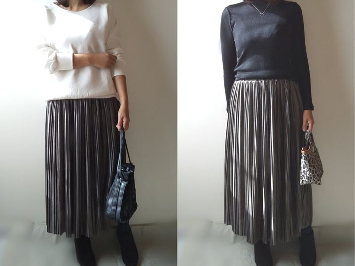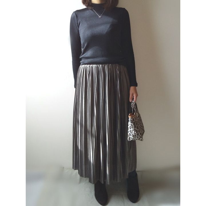 こちらのcocaのプリーツスカート、なんと1,089円でした!ツヤ感があってとても高見えする生地感が伝わるでしょうか?メタリック調のチャコールは、ブラウンやカーキの混ざったようなニュアンスカラーでとても良いお色でした。プチプラなのでウエストは総ゴムですが、そこは着方でカバーできるので問題なし。むしろ、ラクチンなので普段着るのにちょうど良いです。そして、オンラインショップで購入したので小さく畳まれて届きましたが、広げた時にシワ1つありませんでした!滑るようなサテンのような生地でかなりシワになりにくい素材です。