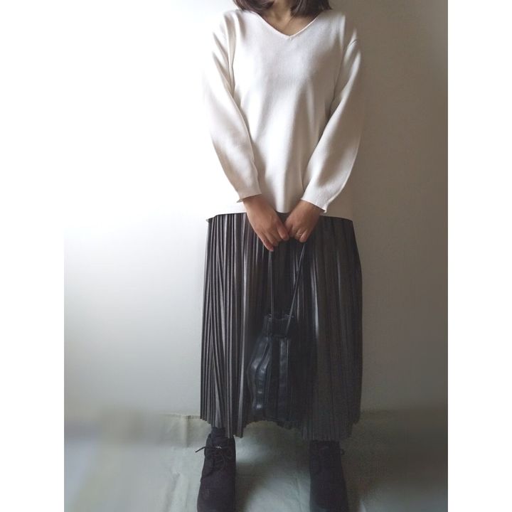 ロングスカートと合わせてみました。身長155cmでMサイズを着用しています。Vネックとゆったりとした身幅のおかげで上半身をスッキリと見せてくれます。せっかくのコクーンシルエットですが、背が低いので前だけインして着る方がバランス良く着こなせます。