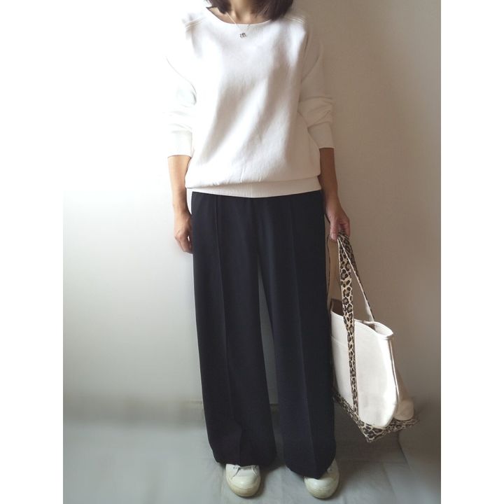 白スウェットに黒パンツを合わせると体操服っぽくなってしまうこともあるのですが、このスウェットは大丈夫でした。ラクチンだけど、ダラしなく見えない大人のカジュアルスタイルを作ってくれます。これが普通のスウェットだと、なかなか難しいんです!