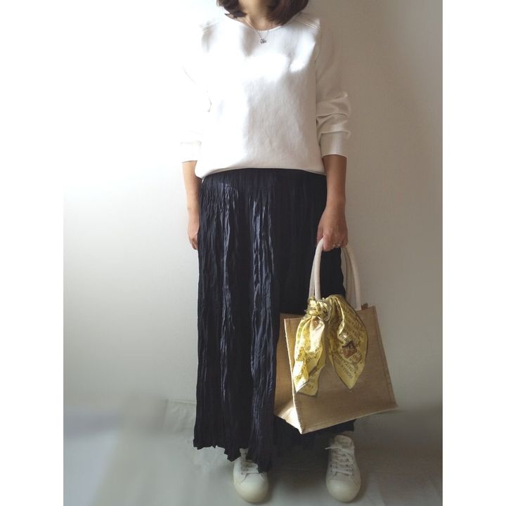 黒のロングスカートを合わせたモノトーンカジュアルコーデ。シンプルだけど間違いないスタイルです。バッグは、無印良品で人気のジュートマイバッグにスカーフを巻いてアクセントに。
