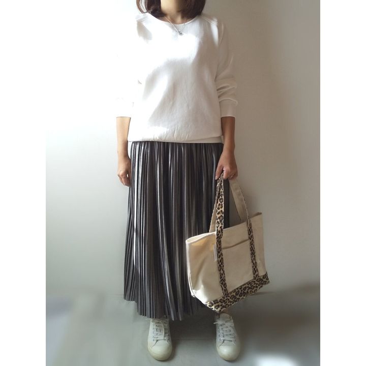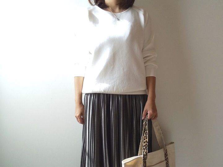 ツヤ感のあるプリーツスカートと合わせてキレイめカジュアルコーデにしました。スウェットの首が詰まっていないから、大人っぽく着られます。ツヤ感スカートは、以前紹介したcocaの神コスパスカート(1,089円)です。上下ともにプチプラだけど、全然チープ感はないし、汚れを気にせず着られるから本当に毎日着たくなります。