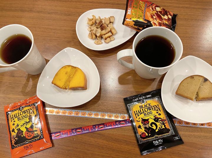 オレンジ色のパッケージは「ハロウィンブレンド」、黒色のパッケージは「ブラックハロウィンブレンド」です。どちらも珍重されているピーペリーという豆を使用し、焙煎の仕方が違っているとのこと。