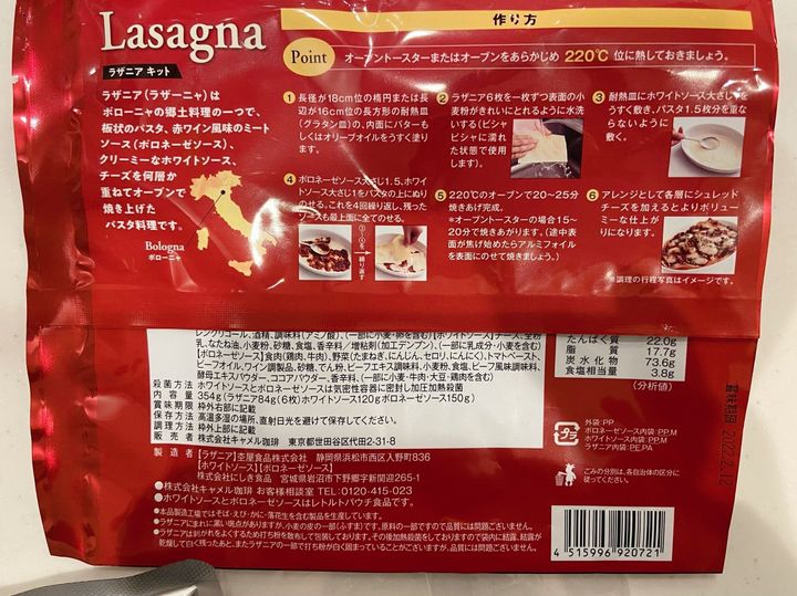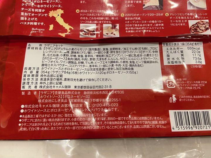 中に入っているものはラザニアパスタと、ホワイトソース、ボロネーゼソースの3点。
