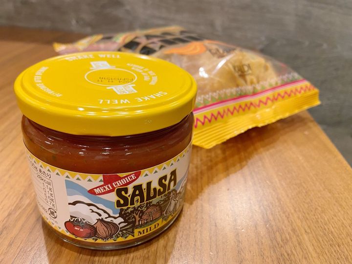 カルディの「メキシチョイス サルサソース(マイルド)」は、隣にタコスチップスまであるじゃないですか!笑