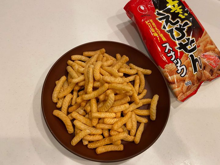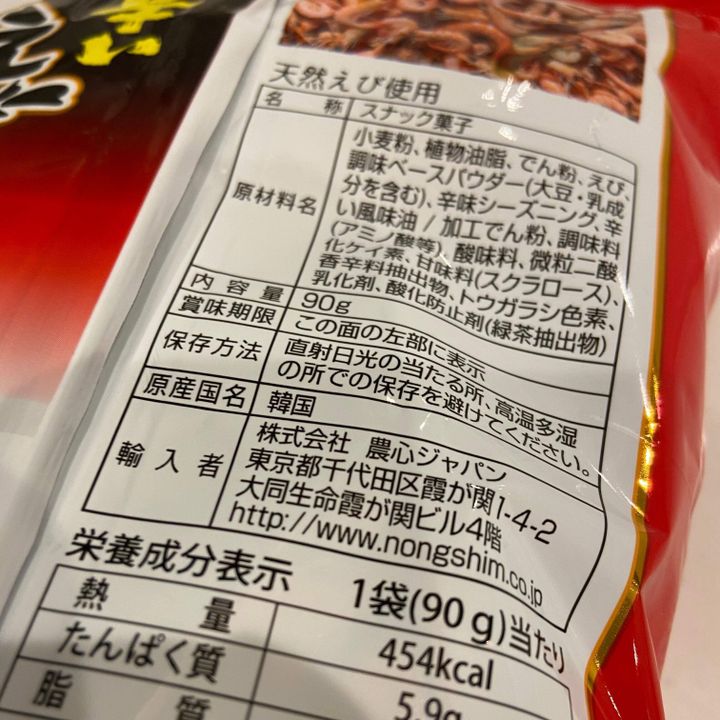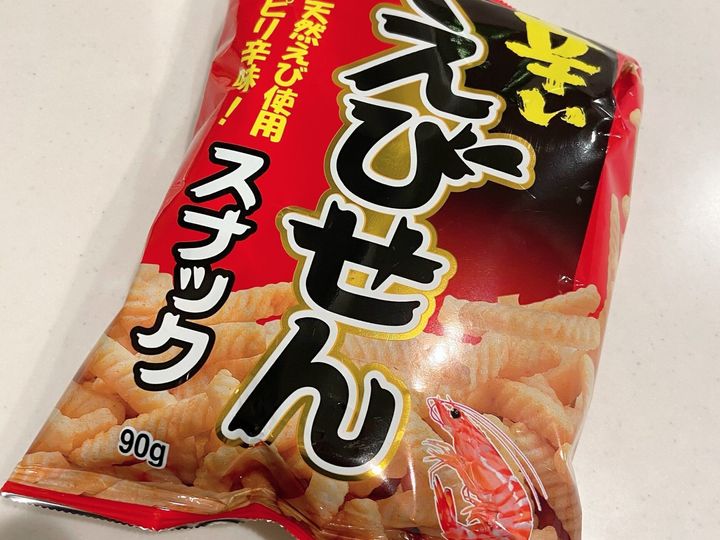 天然えびを使用した、韓国産のピリ辛えびせんがうまい。