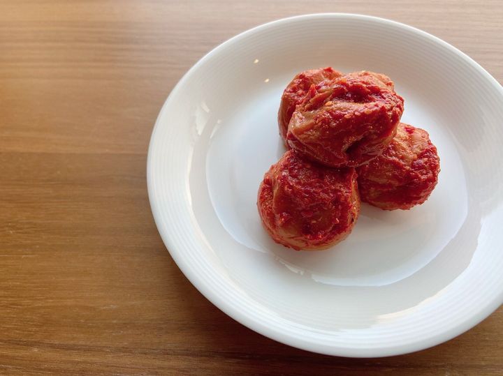 甘酸っぱ辛い、梅干しとキムチの両方のいいところが合わさり旨味があふれています。