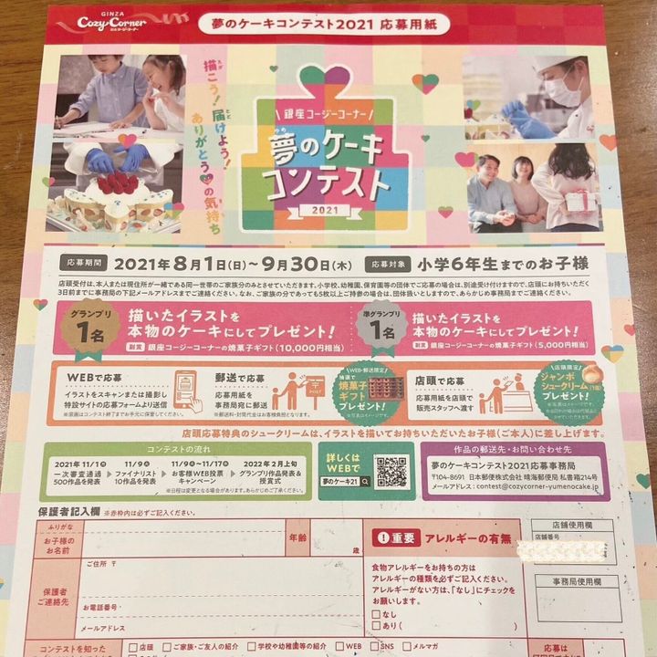 先日ケーキを買いに行った際に、優しい店員さんが「どうぞご参加ください」と笑顔で子どもたちに応募用紙を渡してくれました。