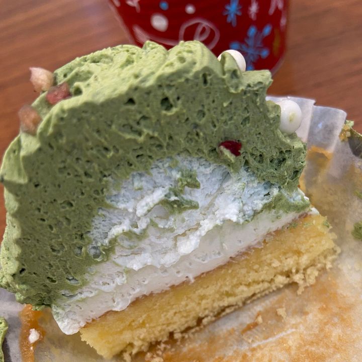 ケーキを半分に切ってみると、外側からは宇治抹茶使用の抹茶クリームだけが見えていましたが、その中にホワイトチョコホイップが隠れていました。