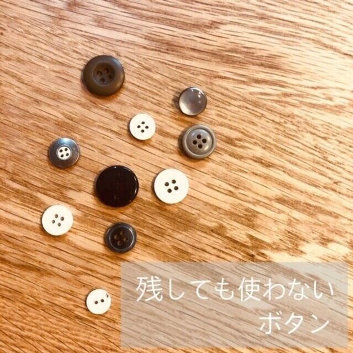 洋服を買ったときについてくるボタン。ほとんど使ったことがないので手放しリストに。ただ、あまり替えがきかないような珍しいボタンは買った洋服の左内側のタグに縫い付けておくことも。それでも過去、ボタンが取れて付け替えることがほとんどなかったので、残すことはしなくなりました。