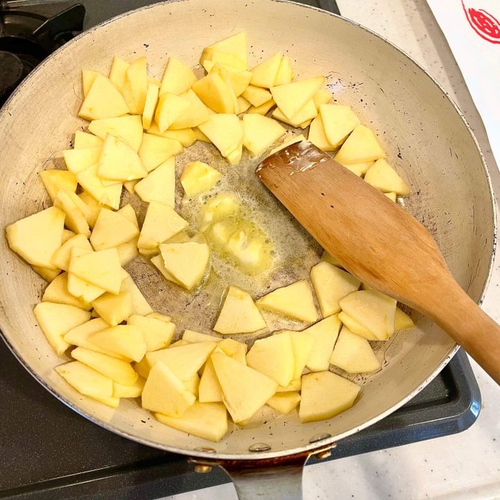 りんごを細かくスライスして、バターで…なのですが、あいにく我が家にはマーガリンしかないのでこれで作ります。雑だなぁ本当に。今回に限らずいつものことなんですがね。ここにグラニュー糖を大さじ1ぐらい入れて煮ます。