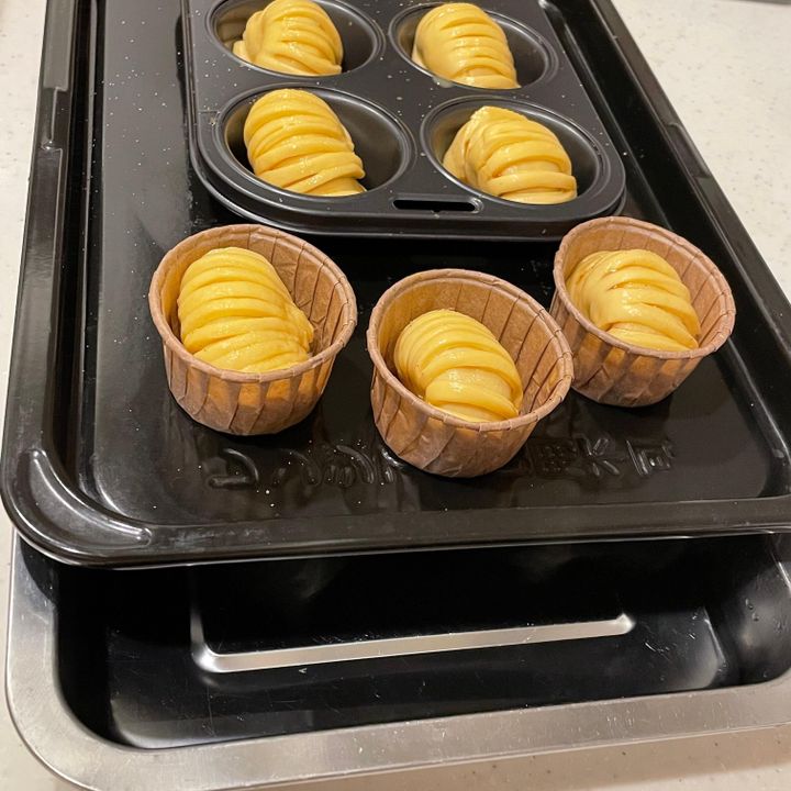 今回は型に6個、セリアの容器に3つ作りました。ちょっと2次発酵がうまく進まなかったので、バットにお湯を入れ下から温めました。濡れ布巾をかぶせて発酵、表面にたまごを塗って照りをつけたら、いよいよ焼きです!