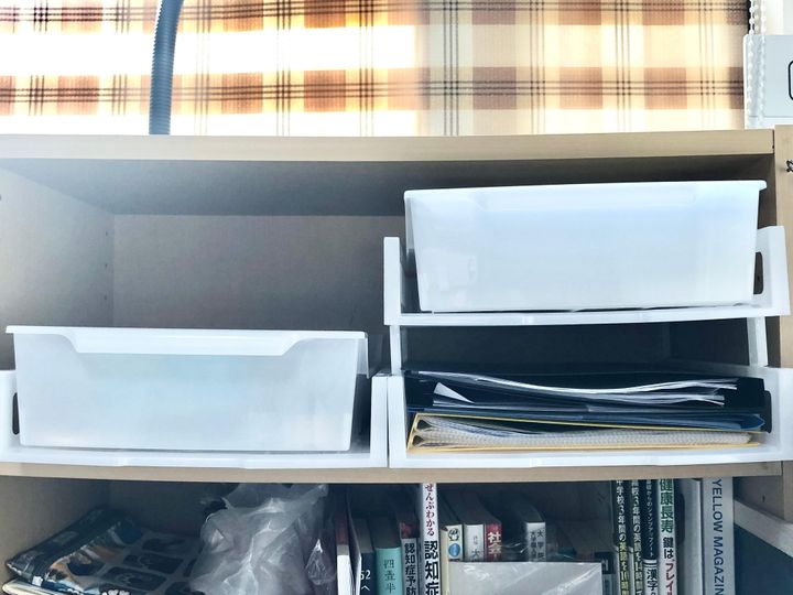 でも2段にしたところ、棚の中にピッタリはまりました。こちらの方が収納としていいなぁと思い、2つに分けることにしました。