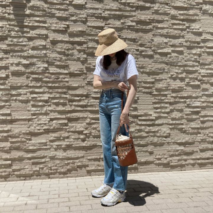 シンプルな白いロゴTシャツとデニムのコーディネートのママさんは、とっても多そう。日差しのシャットアウトも兼ねて、ラフィアハットをかぶって周りと差をつけてみませんか?ラフィアハットは、バックまでツバが広いので首回りの日焼け防止に有効です。