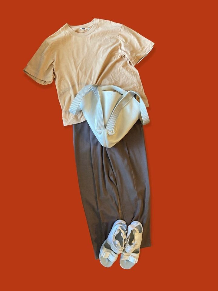 ニュアンスカラーをつなげるように着てみるのも気分。ブラウン~オレンジのトーンで上下ととのえ、バッグは白でキリリと。ブラウントーンにすると、Tシャツコーデも大人っぽく見えるから不思議ですよね。